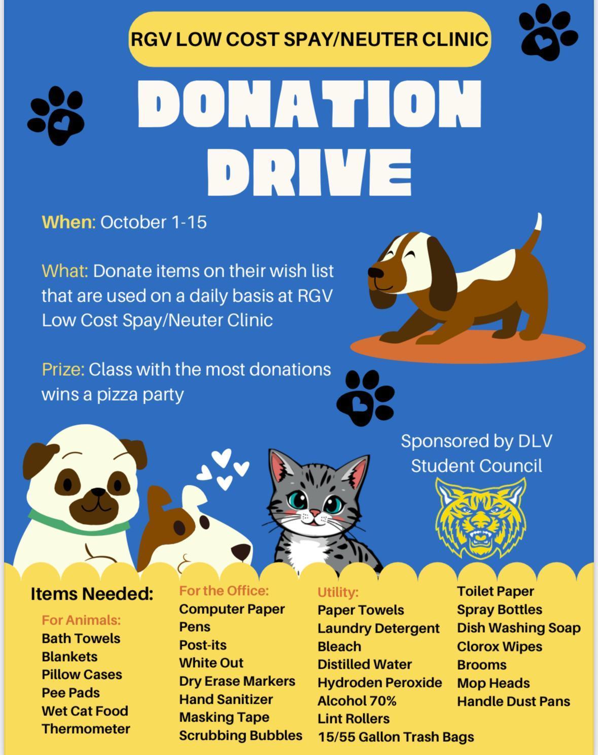 De La Viña Student Council will be hosting a Donation Drive for the RGV Low Cost Spay/Neuter Clinic.