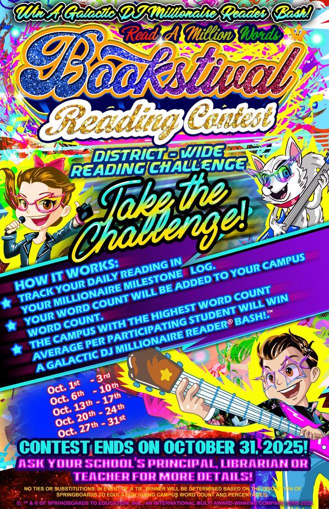 Get ready to dive into books and rack up those word counts! Our school is participating is the ECISD Bookstival Reading Challenge. Bookstival is a reading contest where students compete to read the most words. The school who reads the highest average per student in number of words by the end of the contest will earn a special reward—a DJ 🎶party just for them!
