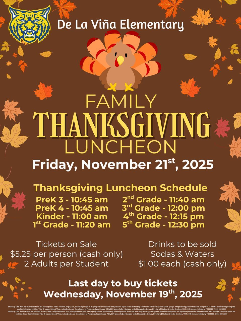 We are excited to announce that De La Viña Elementary is hosting its annual Thanksgiving Luncheon, and we would be honored if you could join us!